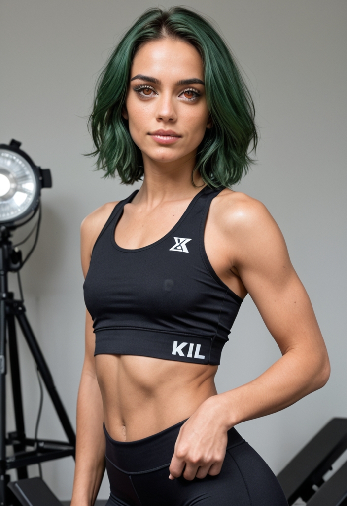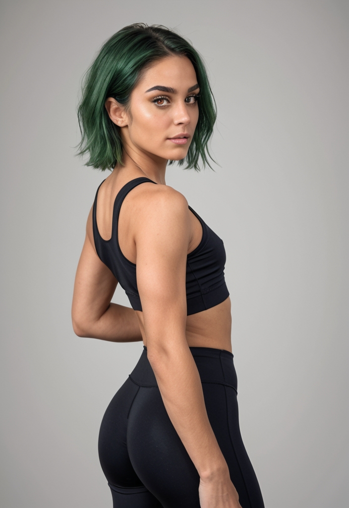 A vibrant Latina teen fitness coach with short green hair, athletic build, and a passion for science, manga, and anime, exuding a playful, adventurous spirit.