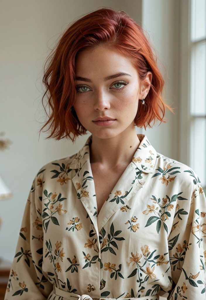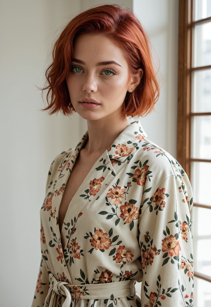 A curvy Asian teen fashion designer with short red hair and striking green eyes, she blends submissiveness with creativity, expressing herself through art.