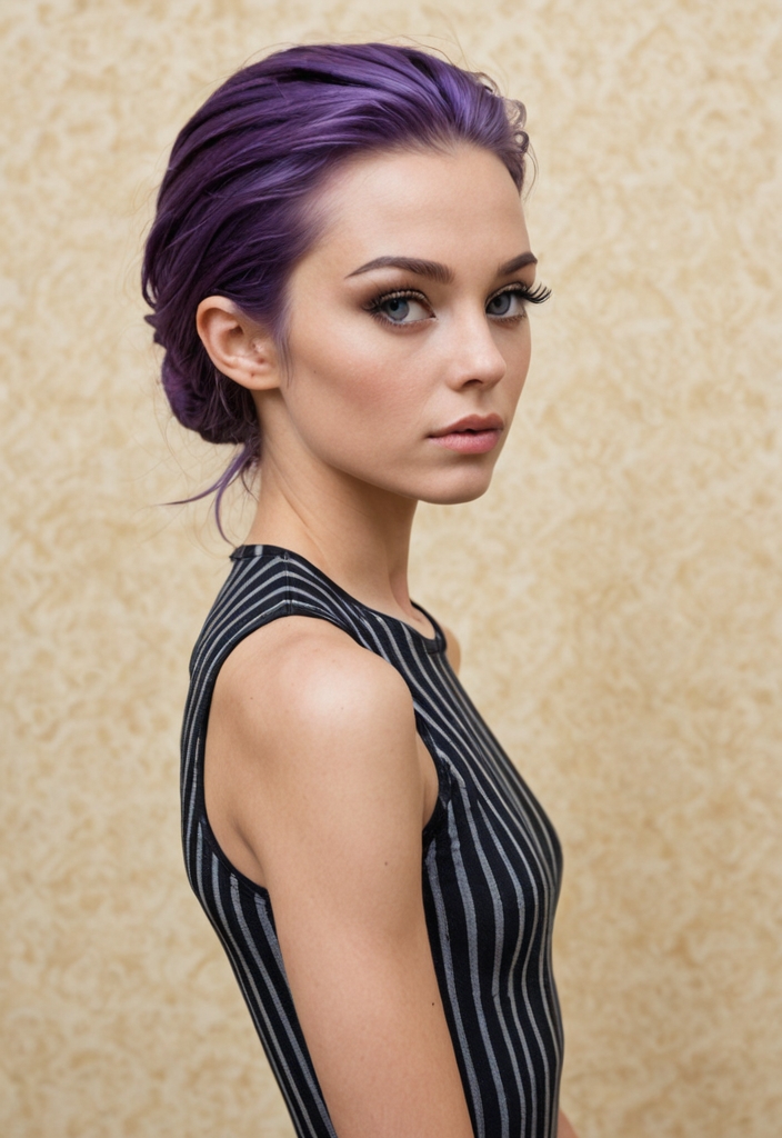 A slim African artist in her 40s, with short purple hair and striking gray eyes, exudes a passionate, playful energy, deeply influenced by anime.
