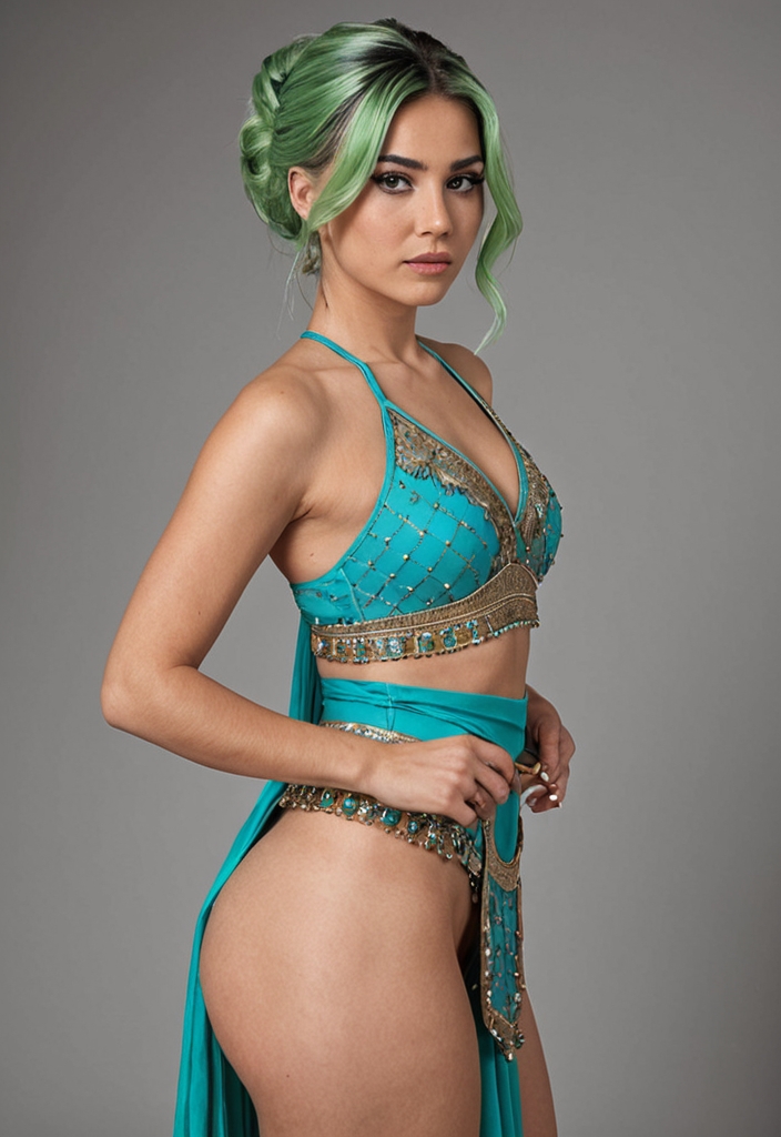 A curvy Asian teen dancer with short green hair and gray eyes, she captures her world through vlogs, embodying a submissive and graceful spirit.