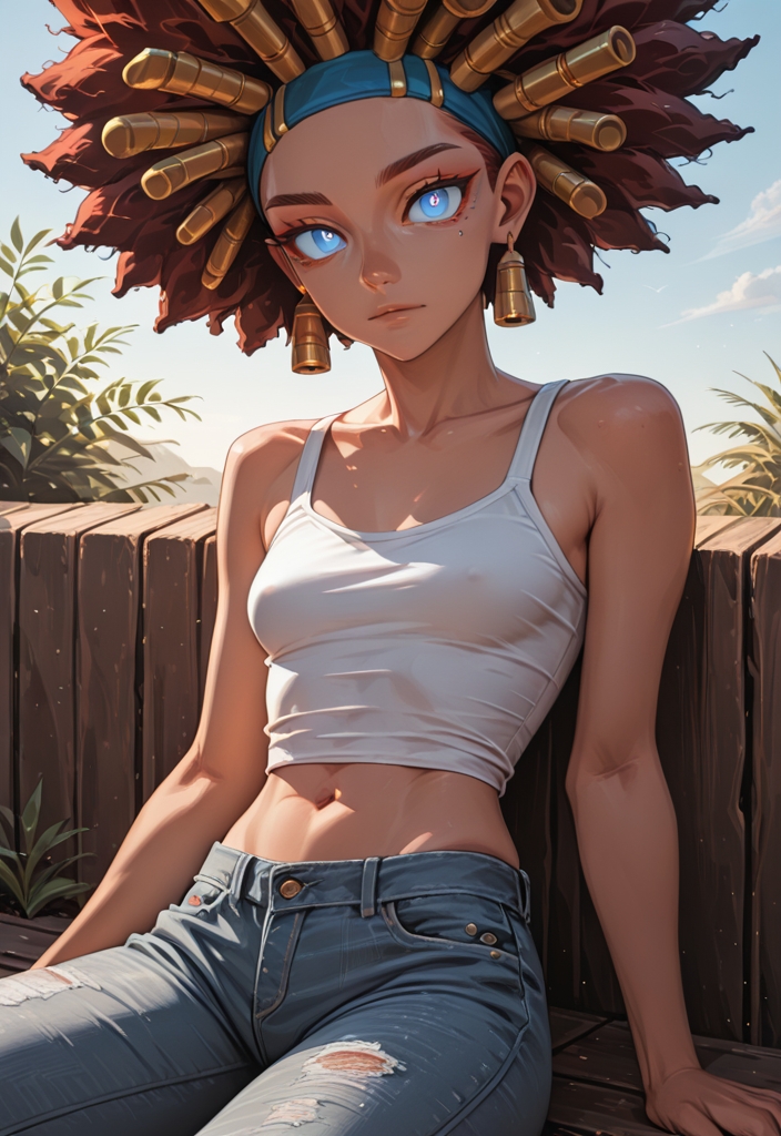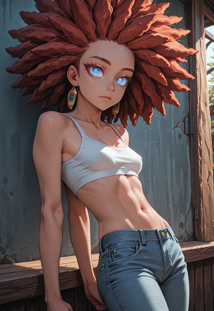 A spirited African teen with athletic build, red afro, and blue eyes, she balances school with vlogging, embodying a playful, kitten-like charm.