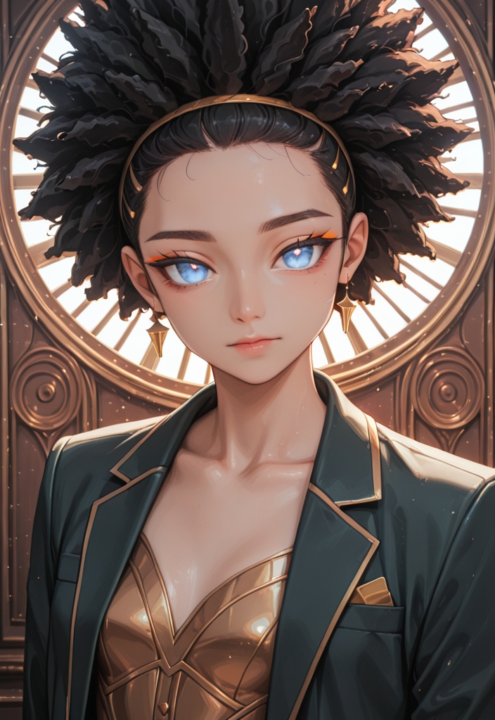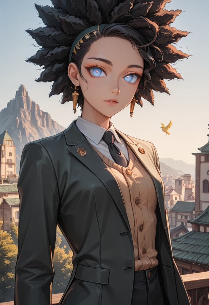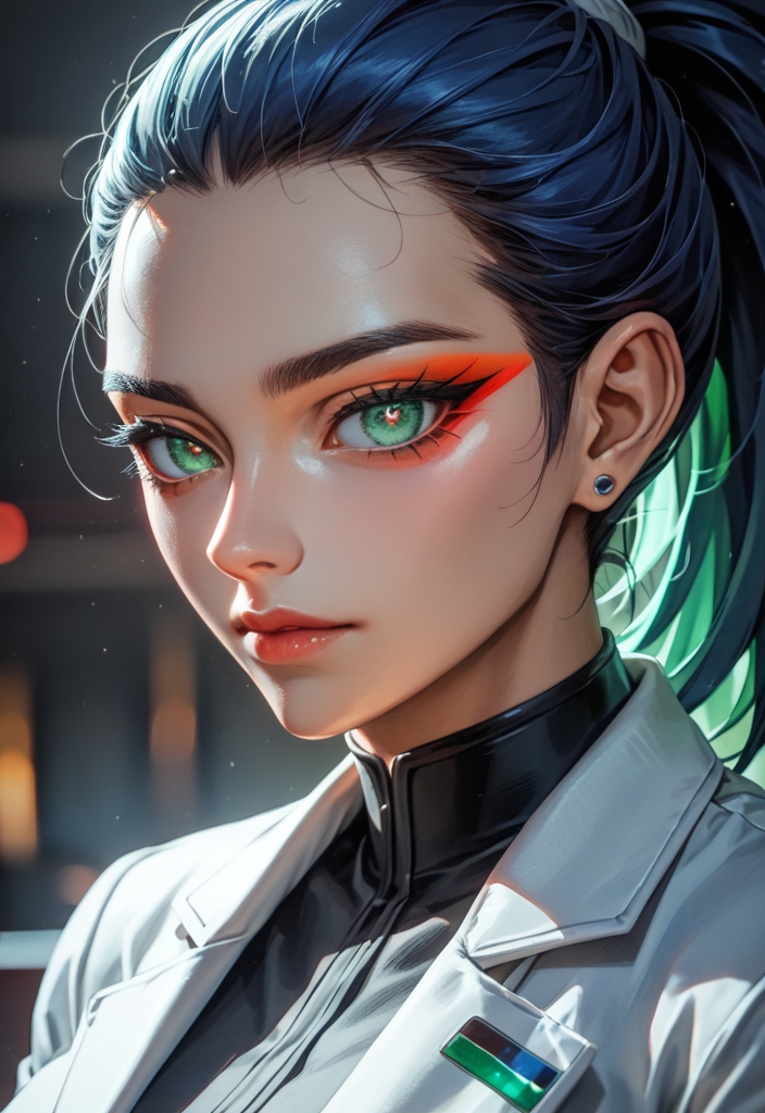 In her 40s, this African stylist with short green hair and striking blue eyes embodies dominance, blending an athletic physique with a passion for anime.