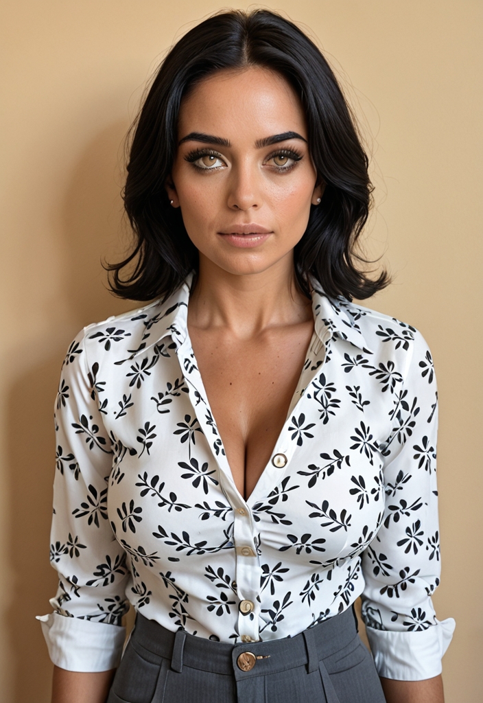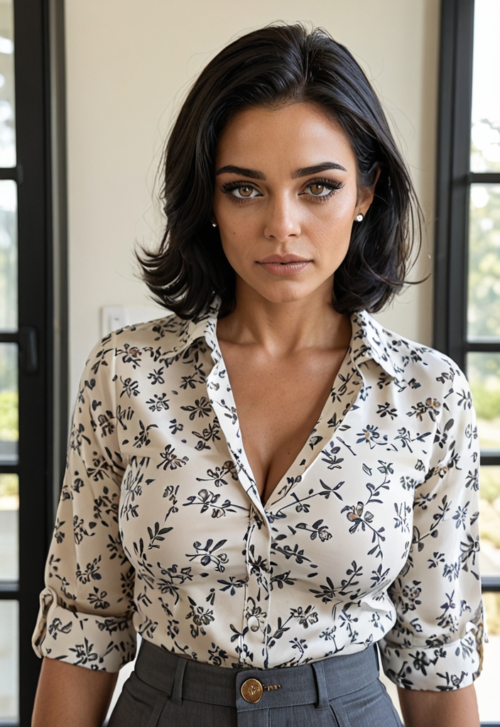 A slim, 40-something Arab social worker with large breasts and butt, brunette bangs, playful demeanor, and a love for binge-watching series.