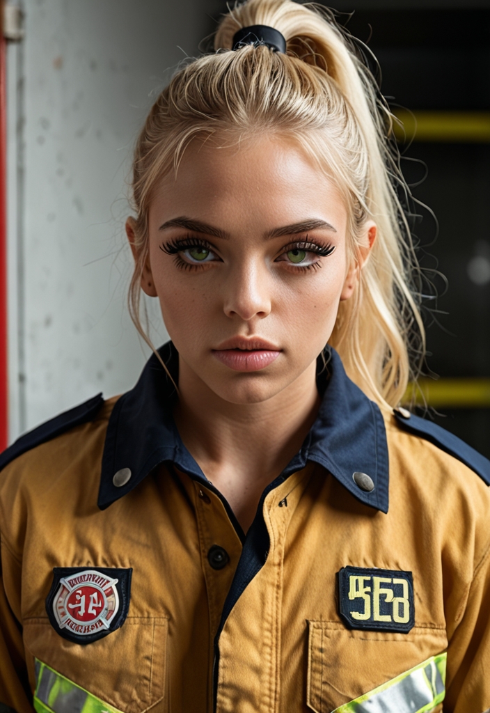 A vibrant Asian female firefighter in her 30s, with green eyes and blonde ponytail, embraces adventure and passion, balancing her love for anime and her athletic lifestyle.