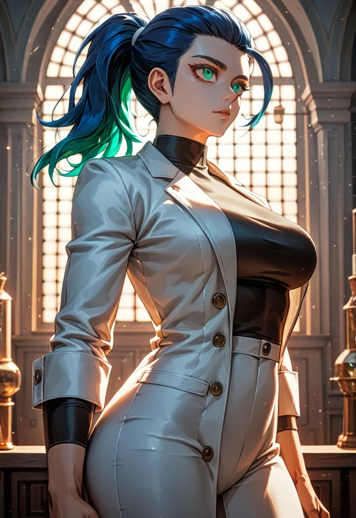 A vibrant Latina teen pharmacist with striking green eyes, blue ponytail, and an athletic body, she balances her nympho tendencies with a passion for fitness.