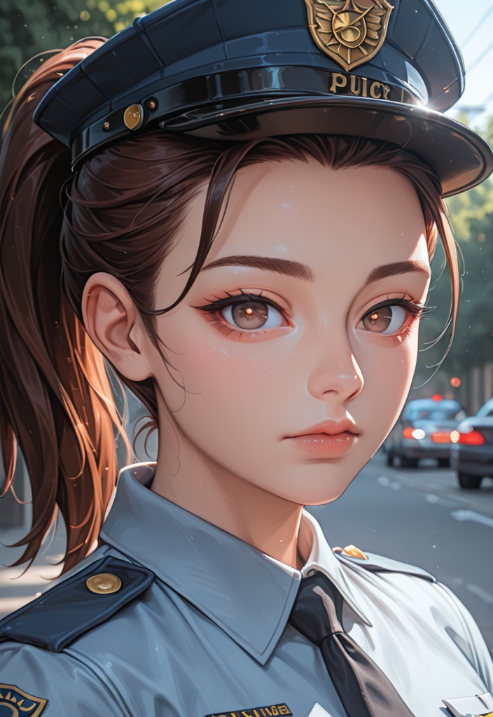 A slim Asian teen police officer with gray eyes and a striking red ponytail, she embodies sensuality and enjoys vibrant parties in her free time.
