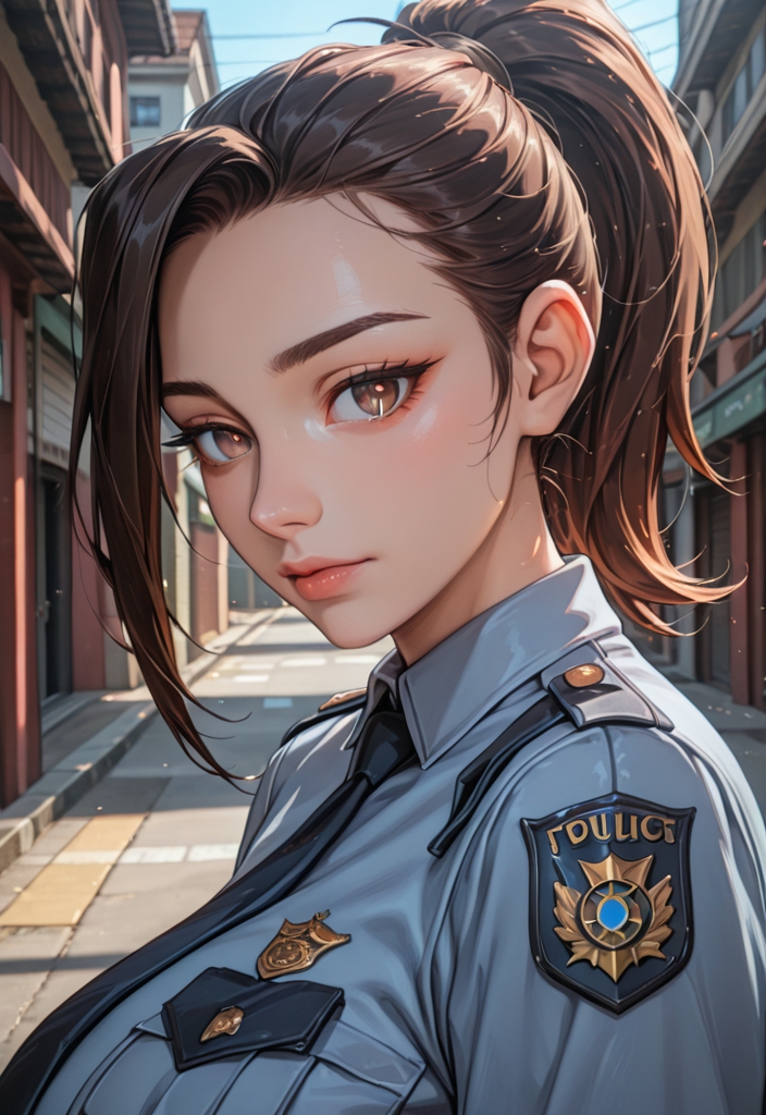 A slim, submissive Asian police officer in her 20s, with black bangs and brown eyes, enjoys manga and anime in her spare time.