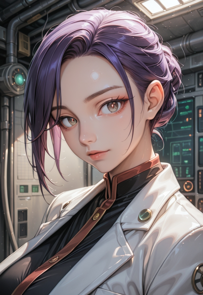 A spirited Asian teen flight attendant with short purple hair, striking blue eyes, an athletic build, and a passion for gaming, exuding confidence and versatility.